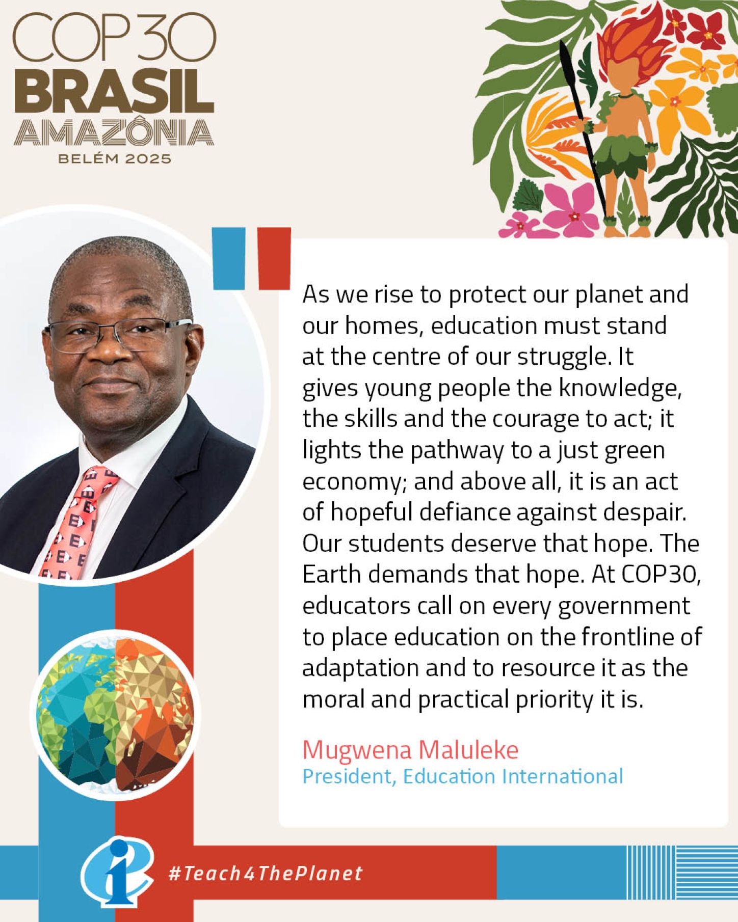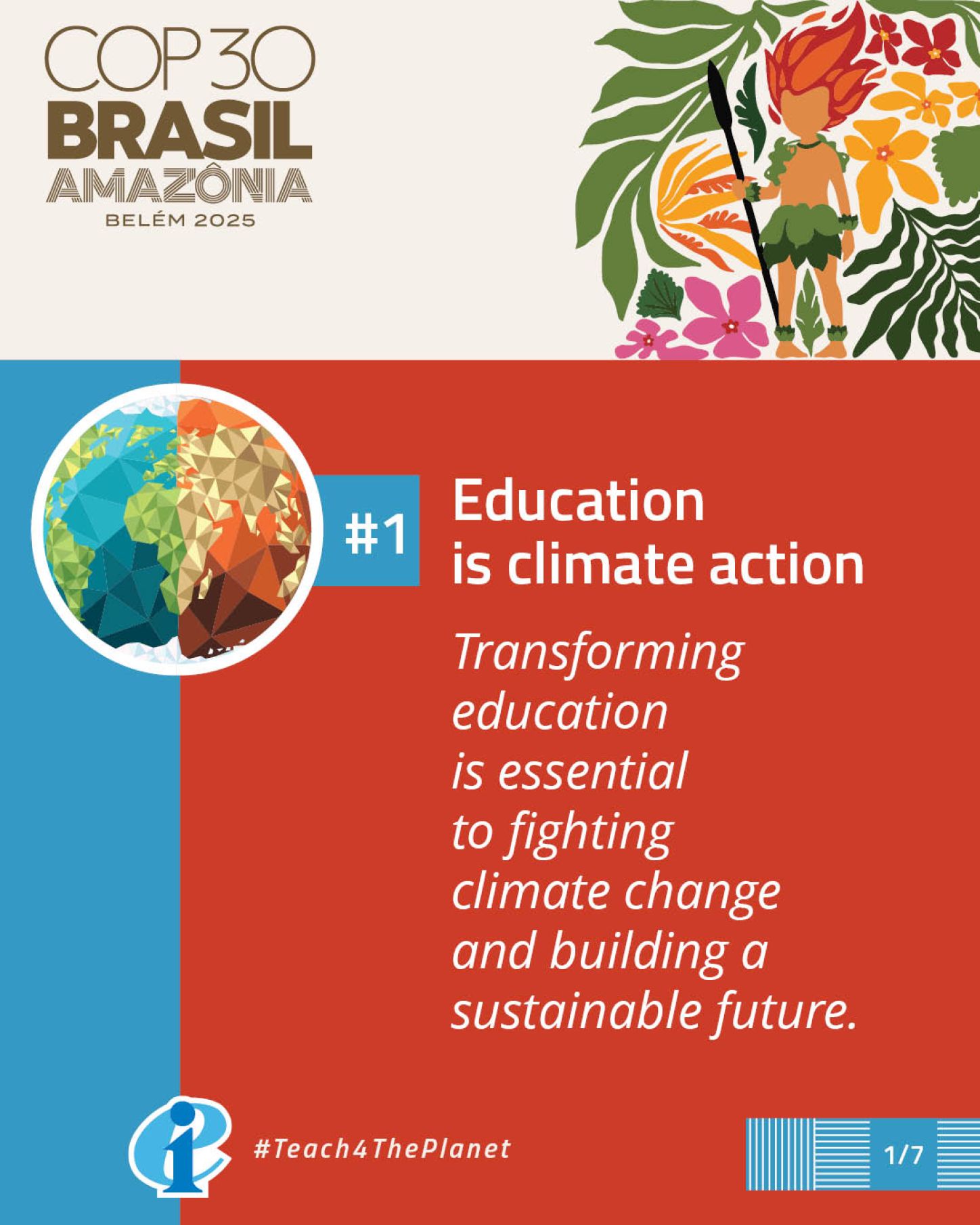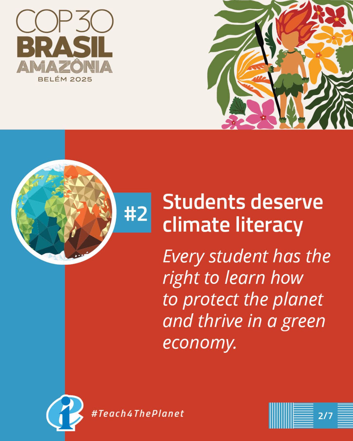 As the world's attention turns to COP30 in Brazil, educators, students, unions, and allies are coming together around the call for governments to provide quality climate education, to build more climate resilient education systems, and to center equity and human rights as part of a just transition to a sustainable future.