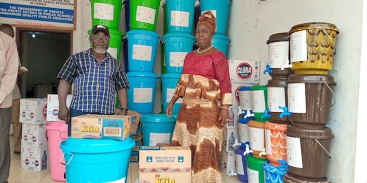 NTAL President Mary W.M. Nyumah, presents Montserrado’s County Education Officer, Samuel Bondo, with personal protective equipment to fight the COVID-19 pandemic in Liberia.