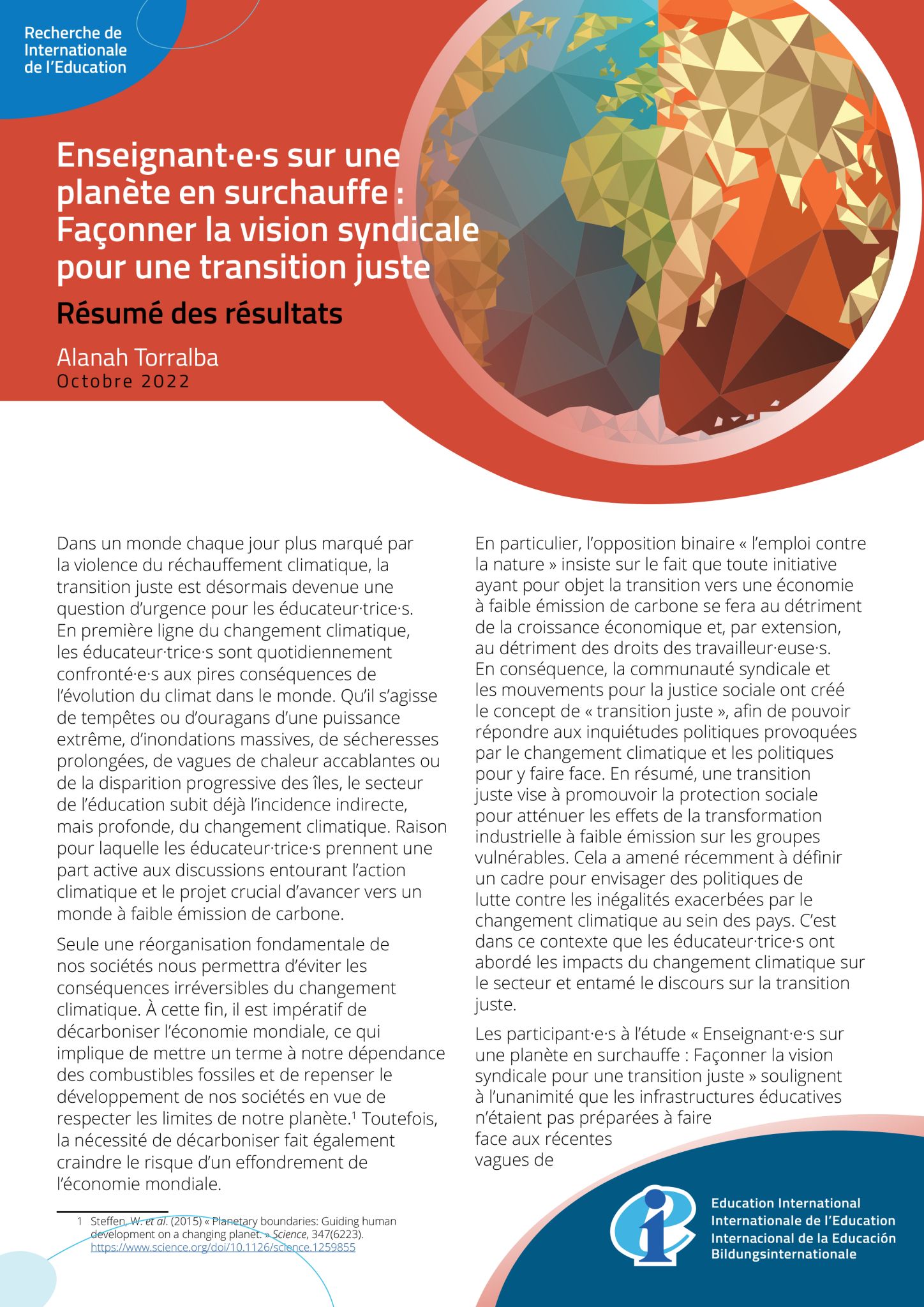 Dans un monde chaque jour plus marqué par la violence du réchauffement climatique, la transition juste est désormais devenue une question d’urgence pour les éducateur·trice·s. En première ligne du changement climatique, les éducateur·trice·s sont quotidiennement confronté·e·s aux pires conséquences de l’évolution du climat dans le monde.