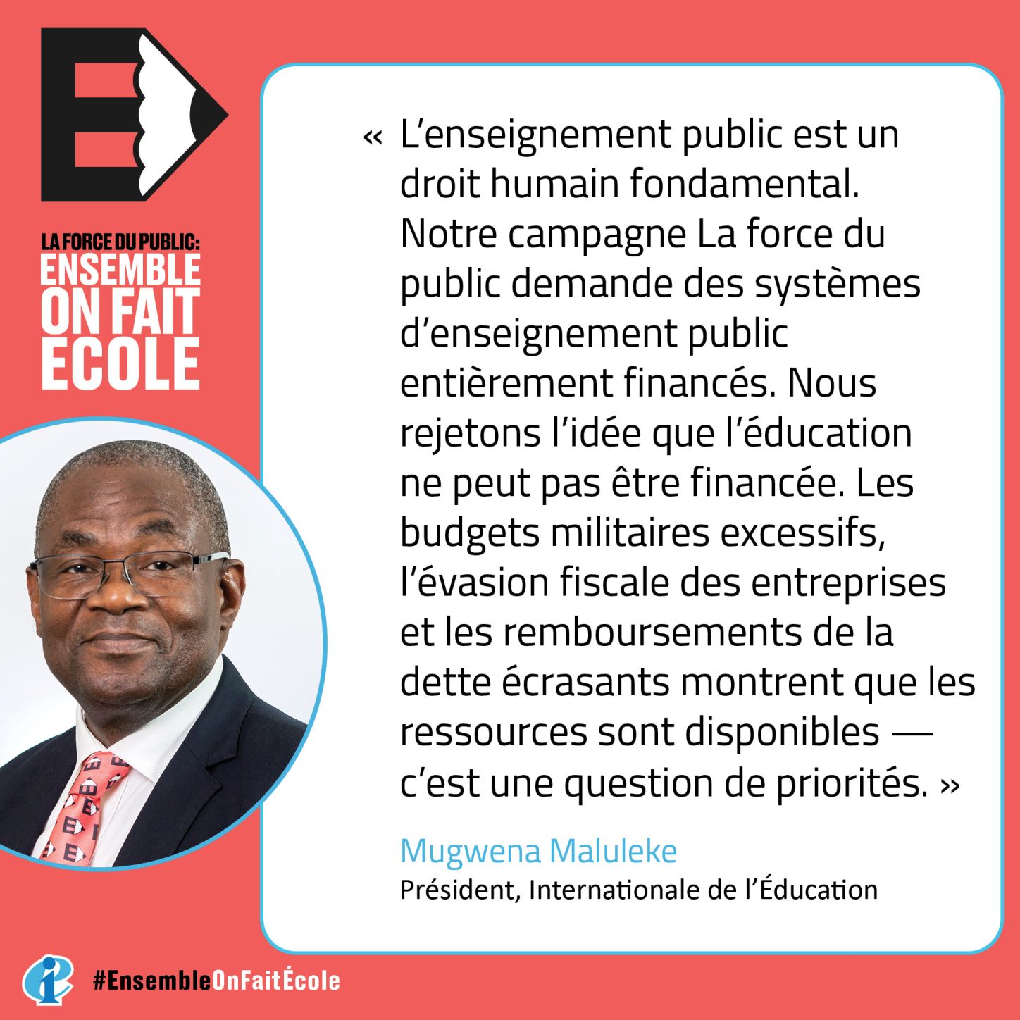 « Nous avons parcouru un long chemin et La force du public nous a rapprochés plus que jamais. La force du public : ensemble on fait école ! est votre campagne. C’est notre campagne, animée par nos valeurs et notre engagement inébranlable en faveur de nos collègues et de nos élèves. L’éducation est un acte d’espoir. C’est un acte de résistance contre la désespérance. Dans un monde au bord de la mutation et du trouble, levons-nous ensemble pour la justice sociale et la paix. Continuons de nous battre pour l’enseignement public, pour la dignité des enseignants et enseignantes, et pour un avenir où la connaissance et l’espoir triomphent de l’ignorance et de la désolation. Ensemble, nous surmonterons n’importe quelle difficulté car notre cause est juste et notre force, sans limite. »